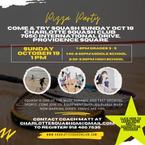 Oct 19 Pizza party come and try squash OPEN HOUSE